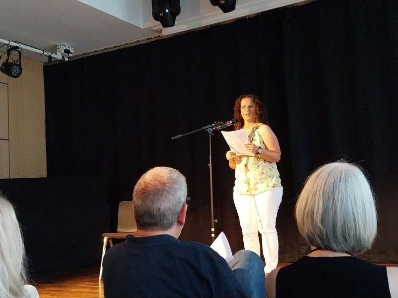Gedichte? Ich bin geschockt, über soviel Vertrauen in meine Kreativität, denn ich habe sie (noch) nicht. Jedenfalls nicht, was Gedichte betrifft. Schließlich treten neben mir bühnenerprobte Poeten auf. Dagmar, die mit ihrer Gruppe Meerbaum und Seitenwind schon seit Jahren im Landkreis präsent ist und dann noch Elisabeth und Andreas, ein Duo, das in Augsburg gleich in verschiedenen Gruppen auftritt. Und Jürgen Schwilski, der in seiner Rolle als philosophierender Pendler Fuko in unserem Landkreis bekannt ist. Vor Jahren führte er Poetry-Slams in unserem alten Kino durch, das es nicht mehr gibt. Ich ahne, dass er so etwas Ähnliches wieder aufbauen will, denn in der AWO Mering entsteht gerade die A(ch)WO-Bühne.  Sie besteht aus zwei Paletten, Mikro und beim zweiten Auftritt im Herbst hängt immerhin schon ein Plakat im Hintergrund.