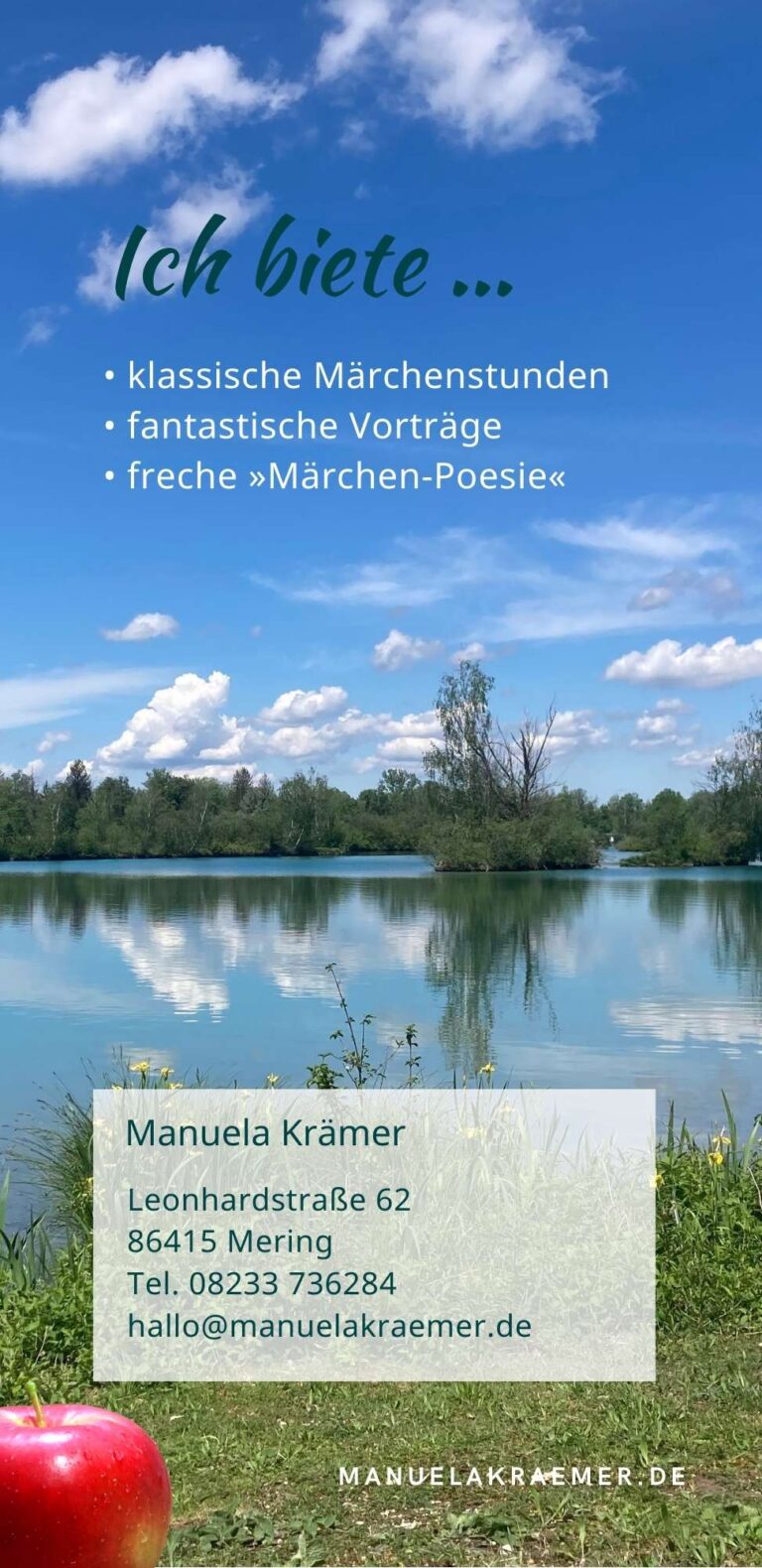 Im August übernehme ich wieder ehrenamtlich die Planung der Märchennachmittage als Beitrag zum Ferienprogramm. An anderen Terminen erzähle ich gegen Bezahlung als Manuela de Moringa. Den Namen gebe ich mir jetzt, wenn ich als Märchenerzählerin unterwegs bin. Moringa lautet der alte Name von Mering, der Marktgemeinde in der ich lebe.