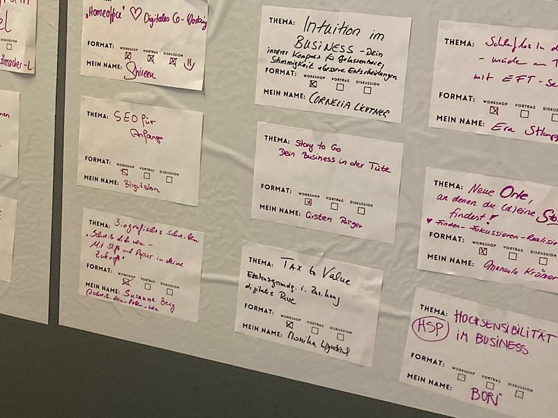 Ich biete einen Kurz-Workshop zum Storyfinden an. Mein Workshop ist ein Auszug aus meinen Trainings, und es finden sich tatsächlich Teilnehmerinnen. Das hätte ich nicht erwartet, denn mein Workshop findet zeitgleich mit anderen spannenden Sessions zu LinkedIn, Fotografie und Co. statt. Da genug mitmachen, führe ich meinen Workshop „Story Finder“ durch und erfahre so viel über meine Teilnehmenden. Zum Beispiel, wie sie Storytelling für ihr Thema nutzen. Sehr bereichernd!